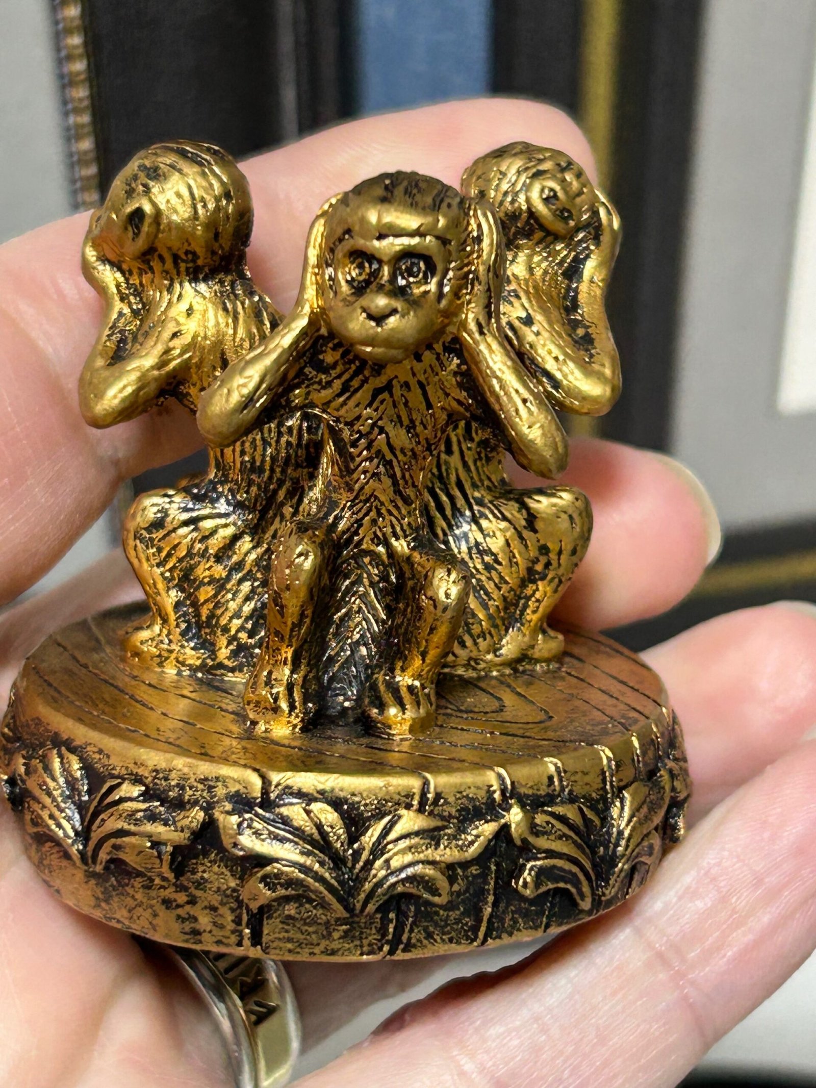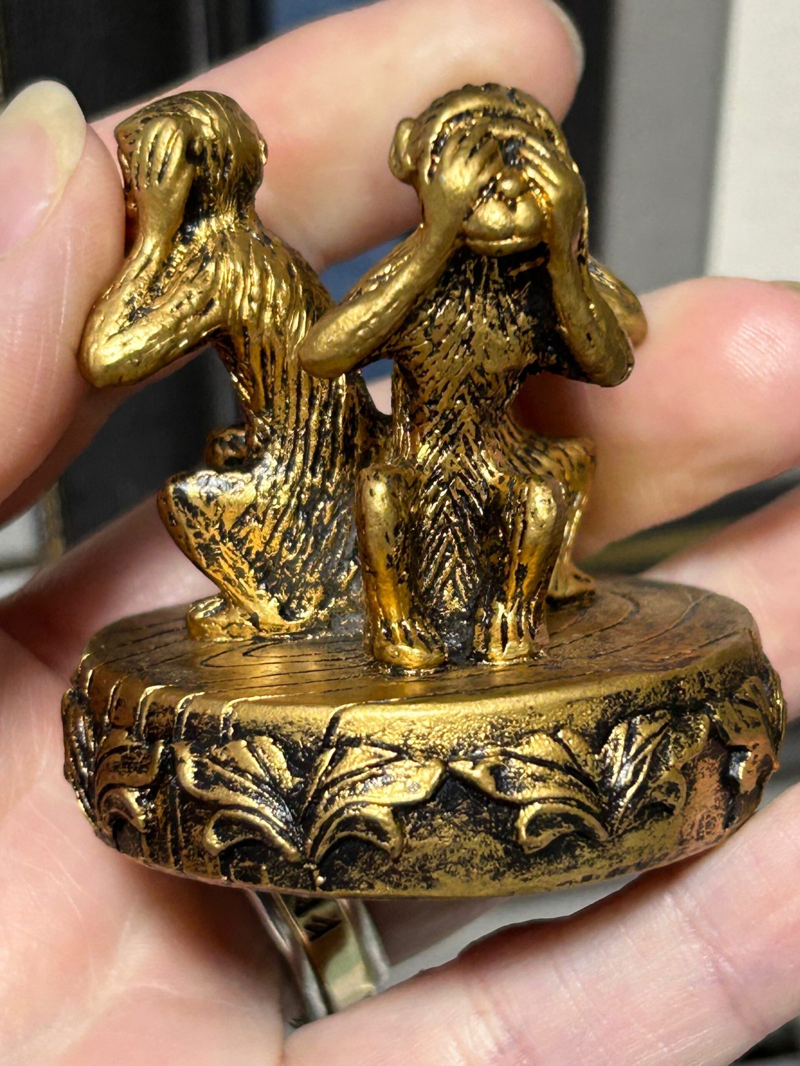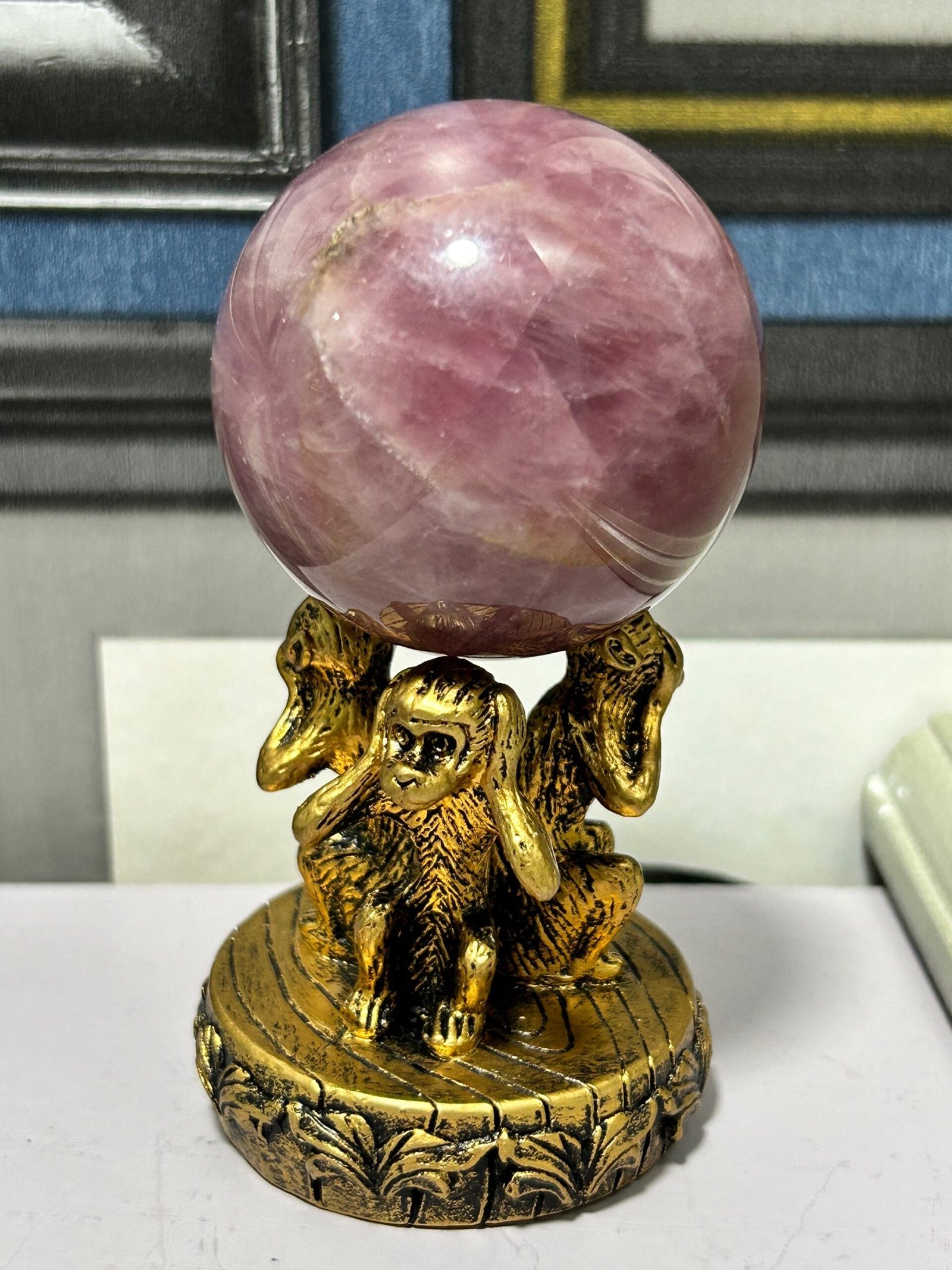 Gold coloured sphere stand with the 3 wise monkeys, hear no evil, see no evil and speak no evil. Ideal for small to medium sized spheres.