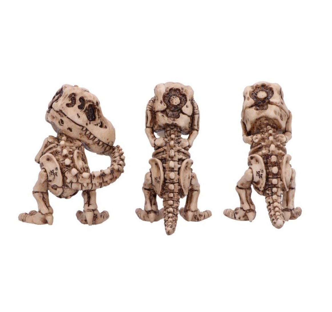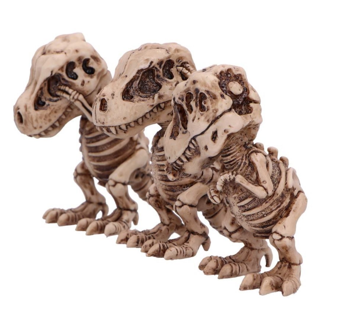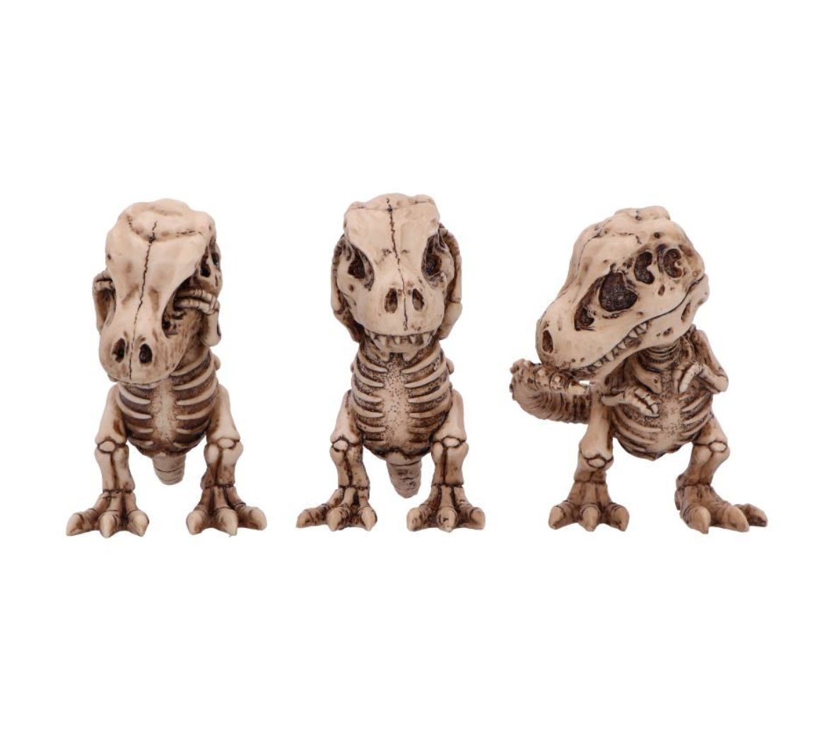 T-Rex Skeleton in the iconic see no evil, hear no evil and speak no evil poses