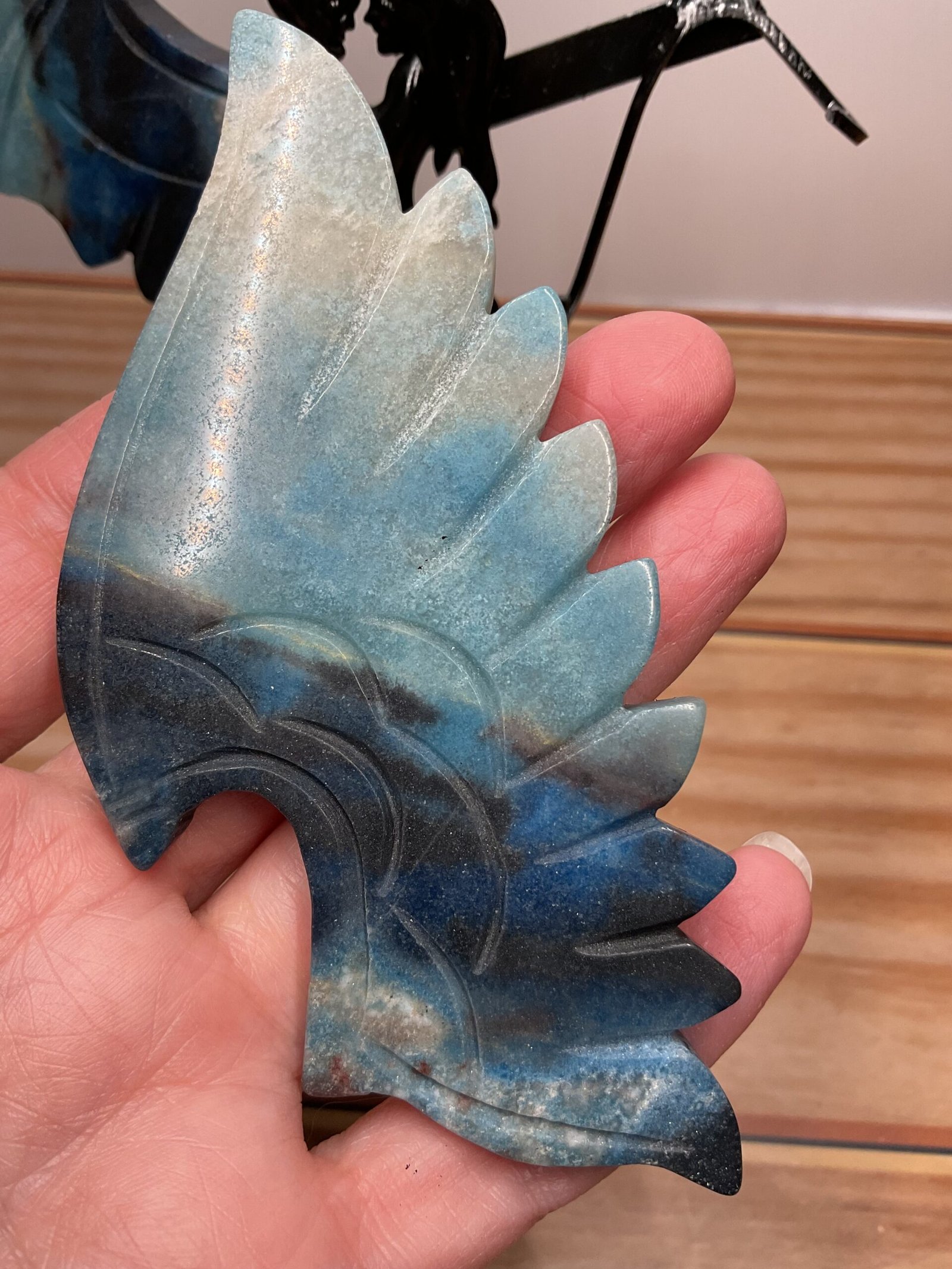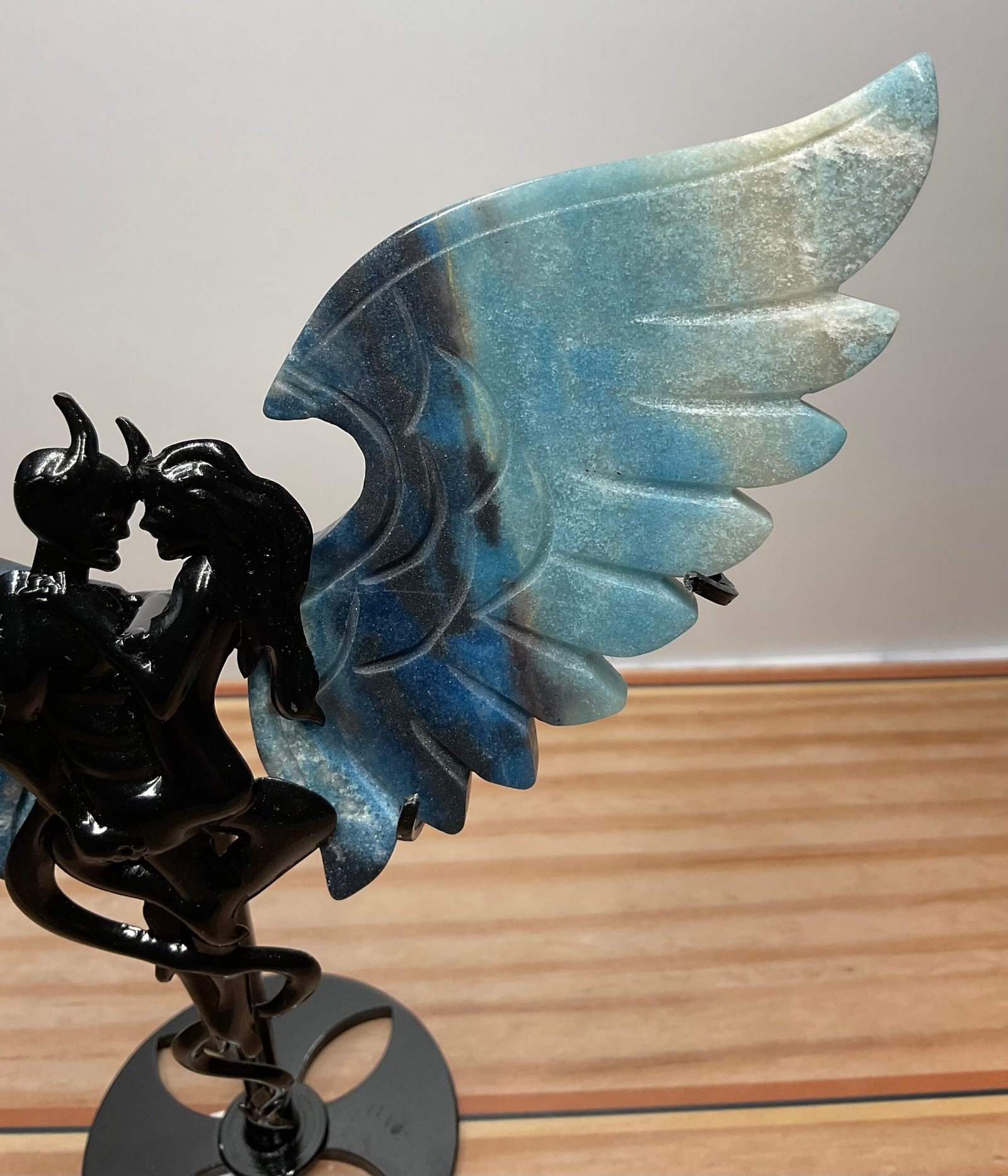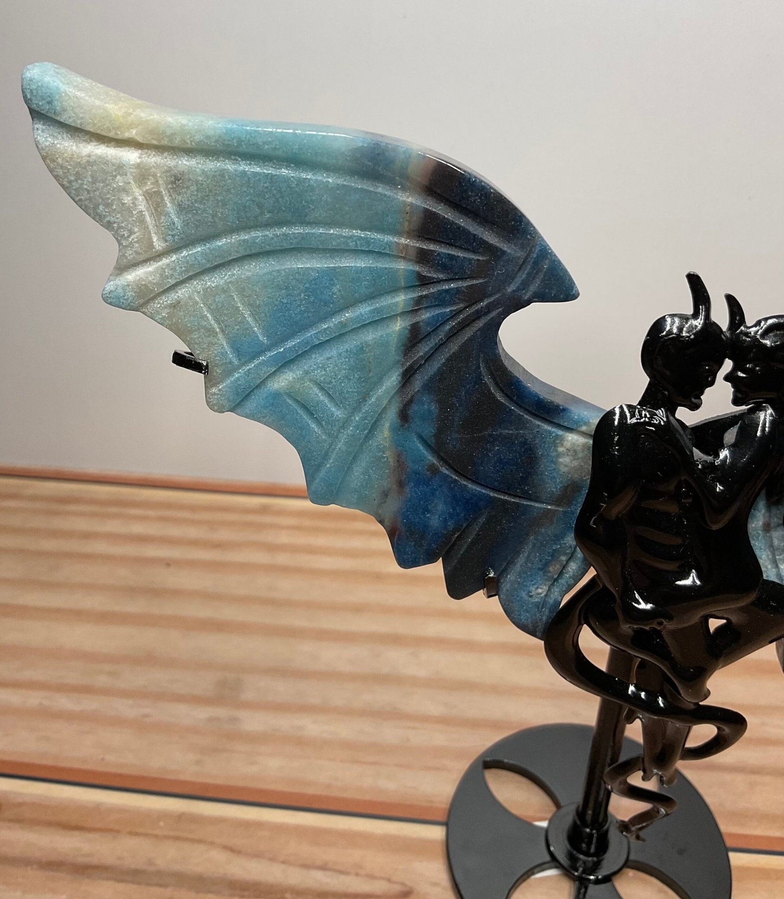 Gorgeous, rare Trolleite caved demon wings on a custom stand featuring 2 intertwined demons.