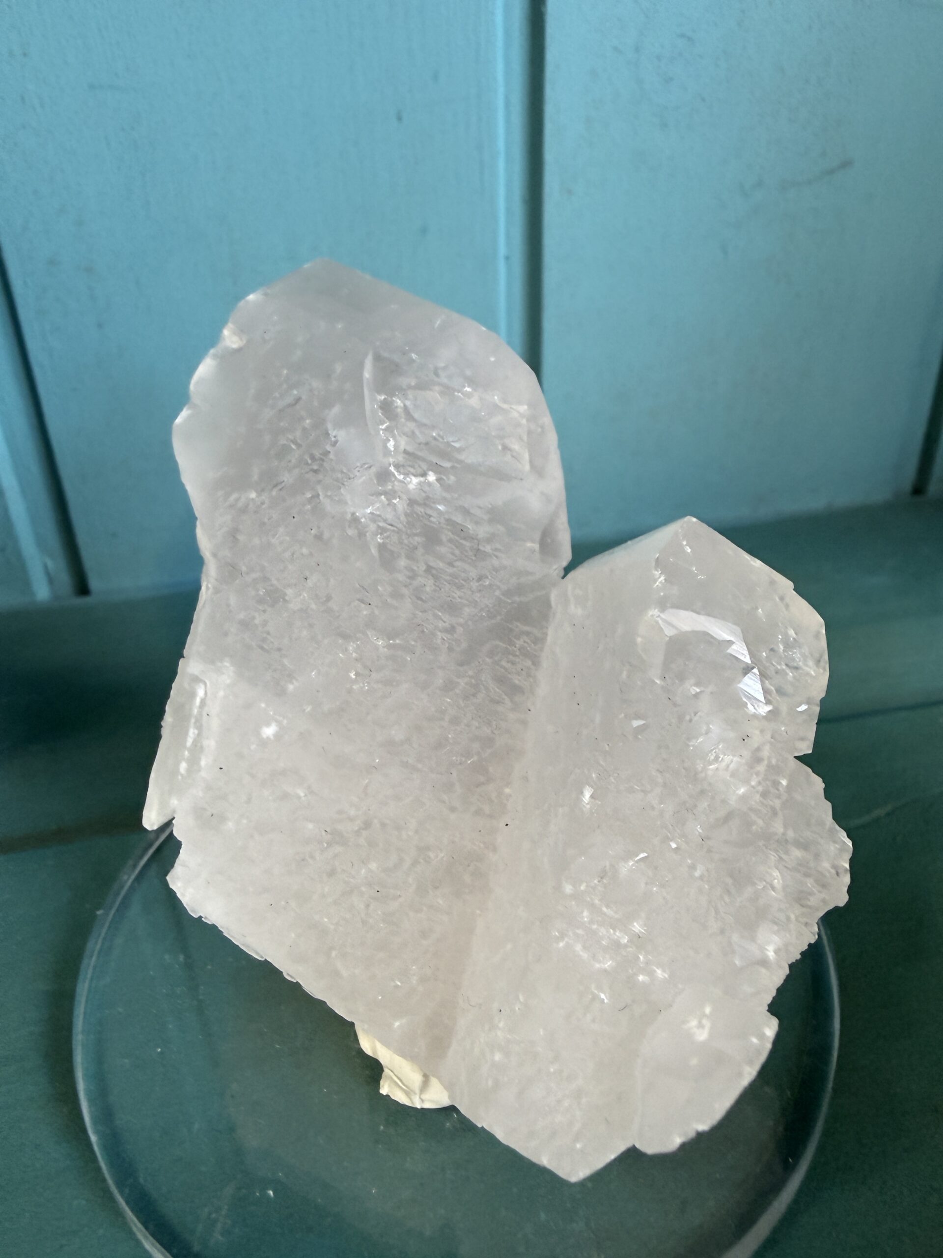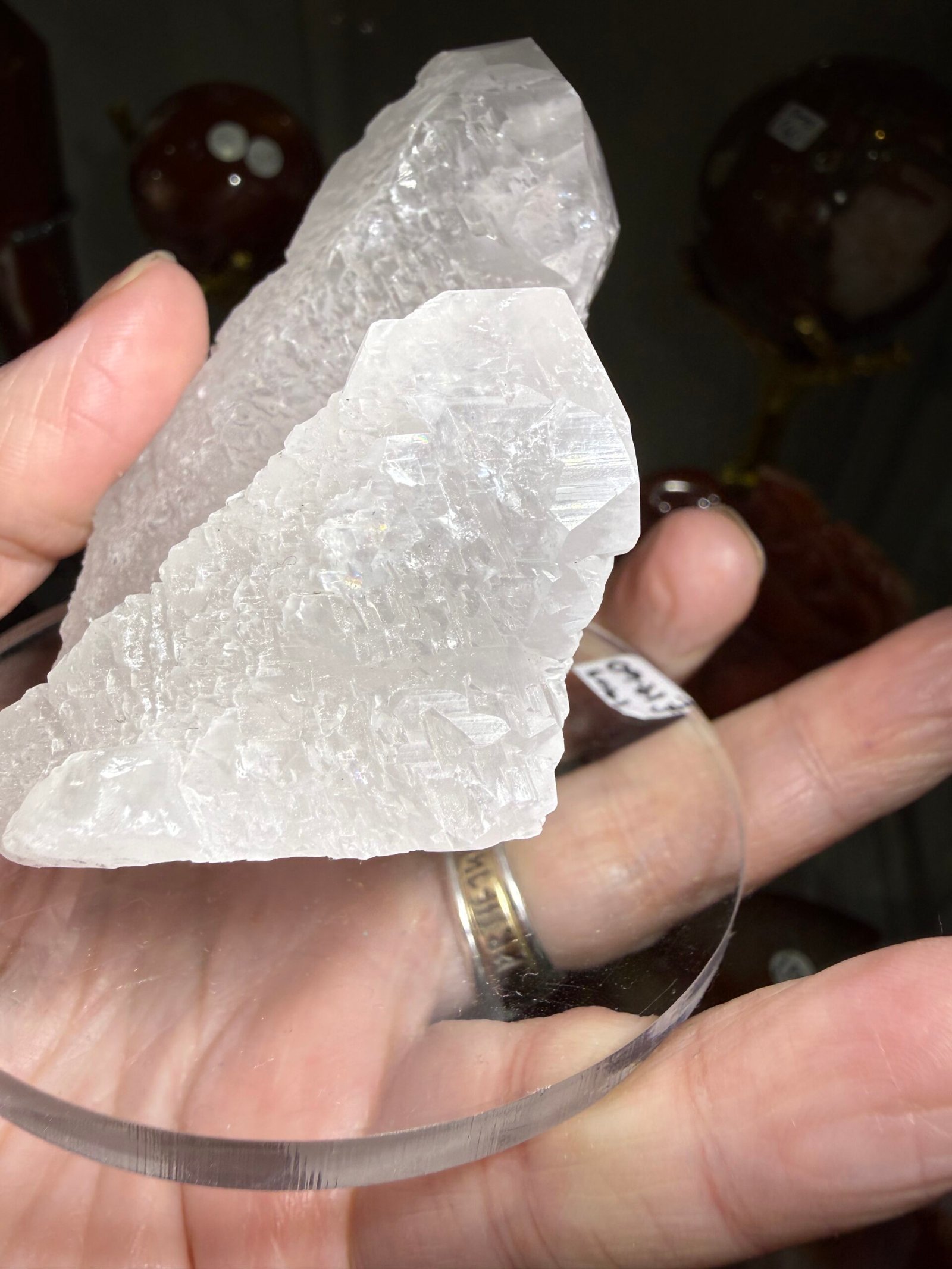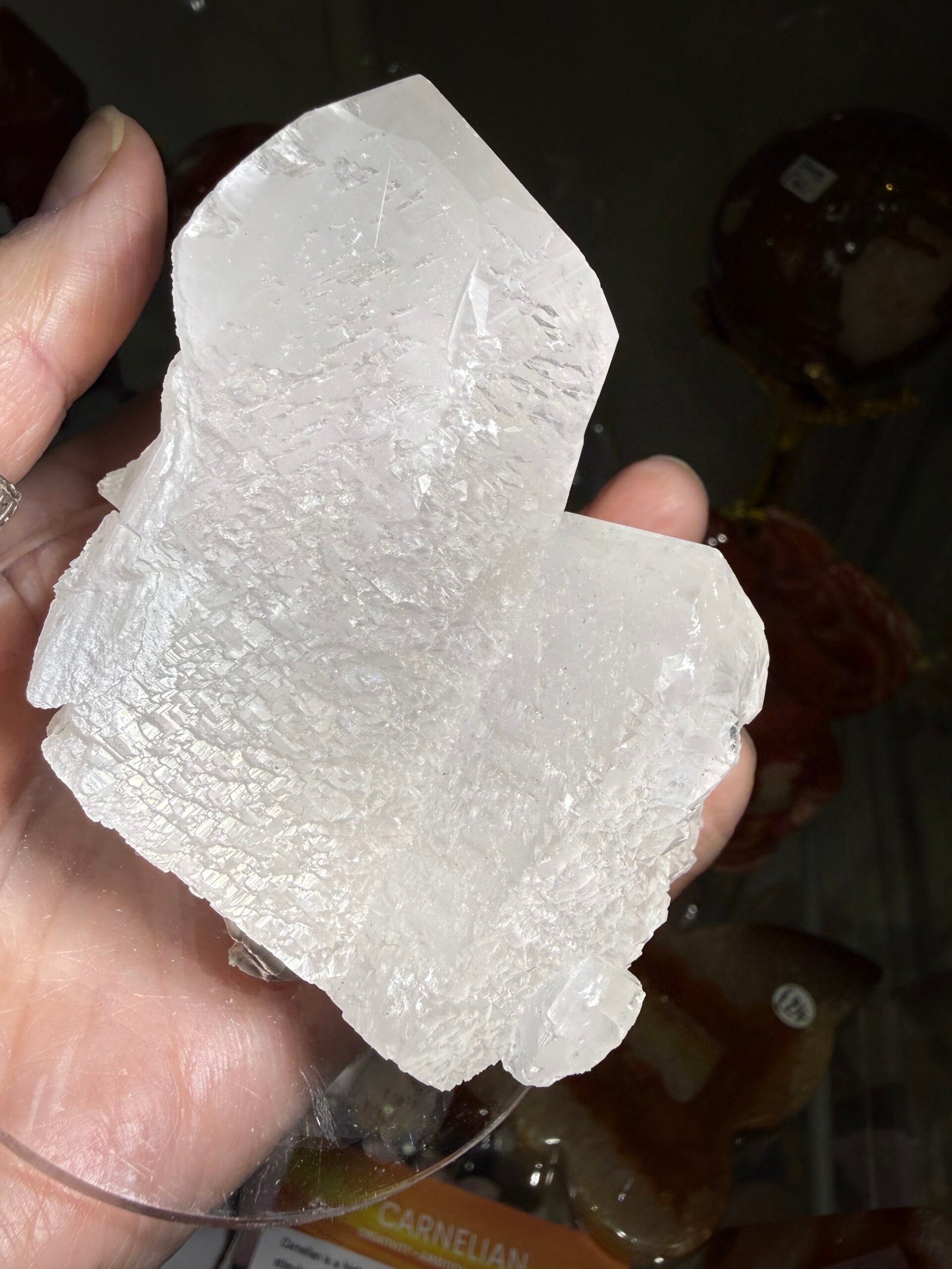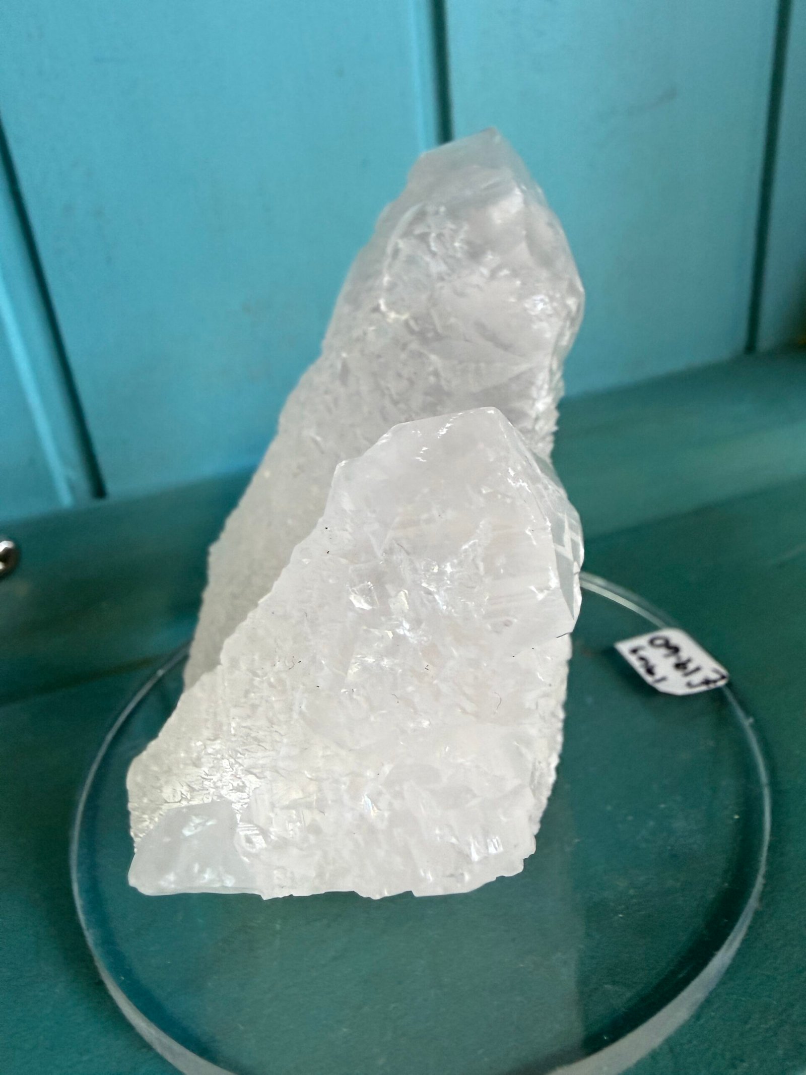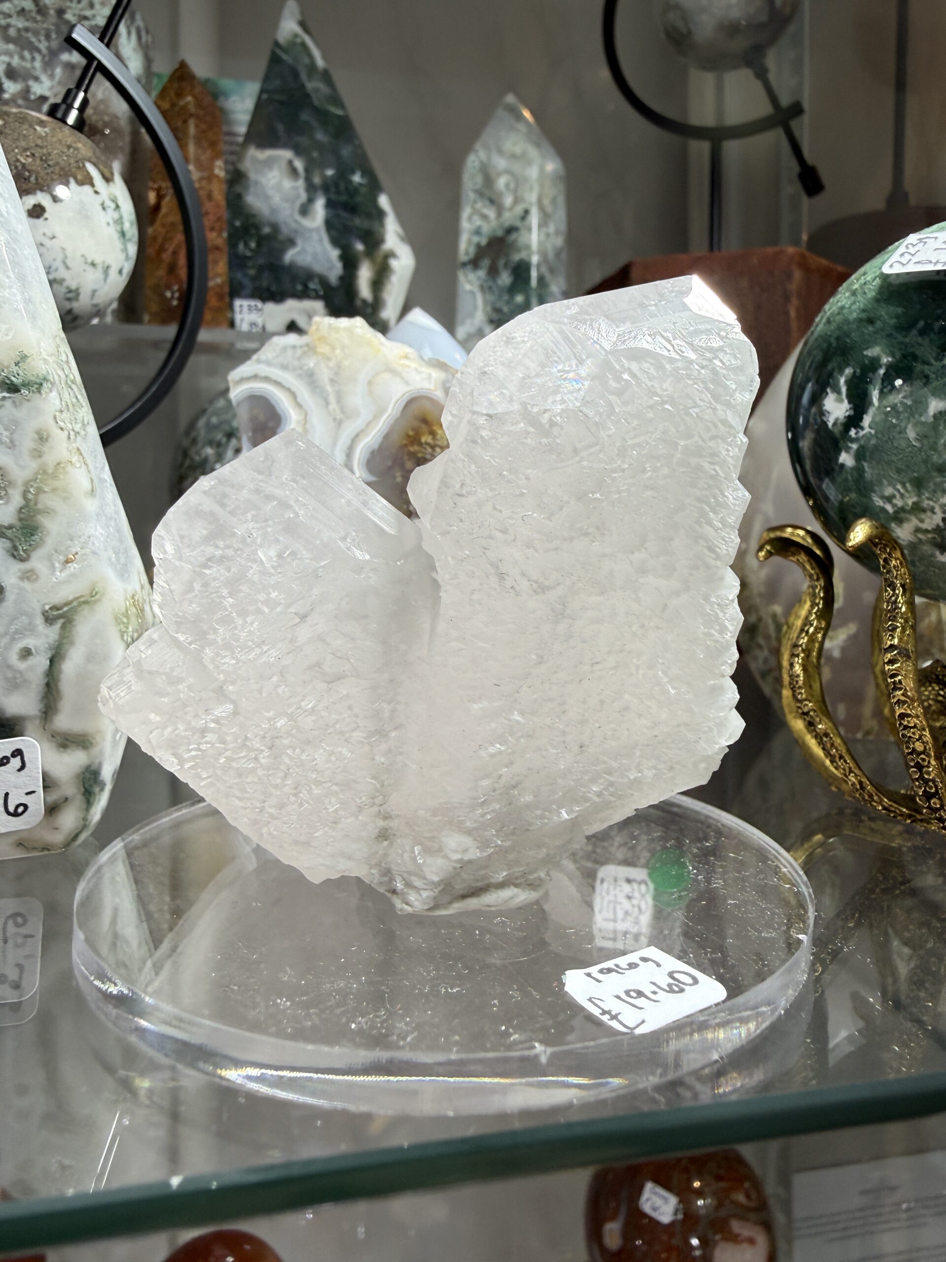 This beautiful specimen features two ‘points’ of the lustrous and unusually etched pink feather calcite. This piece comes with an acrylic stand to display.
