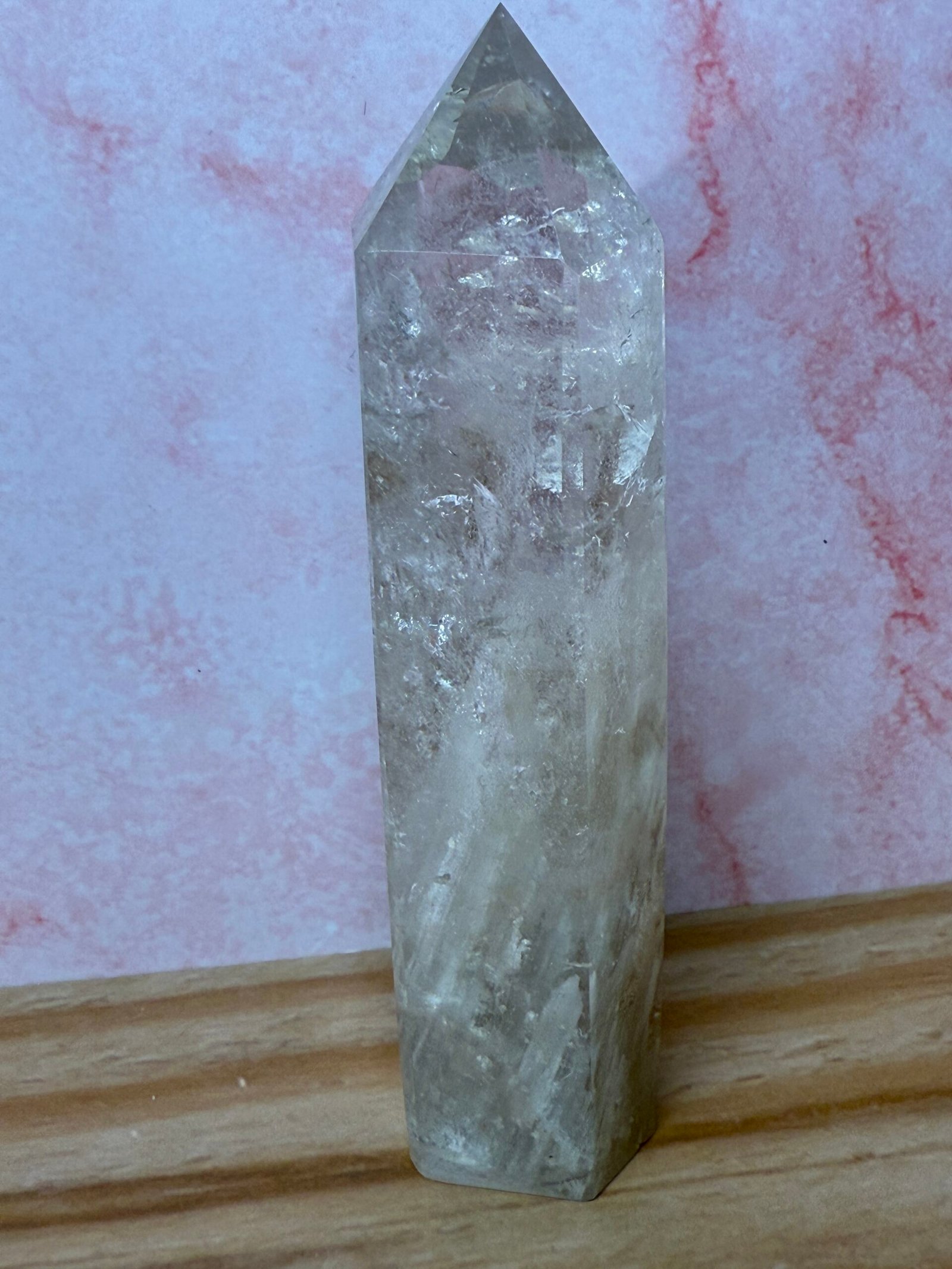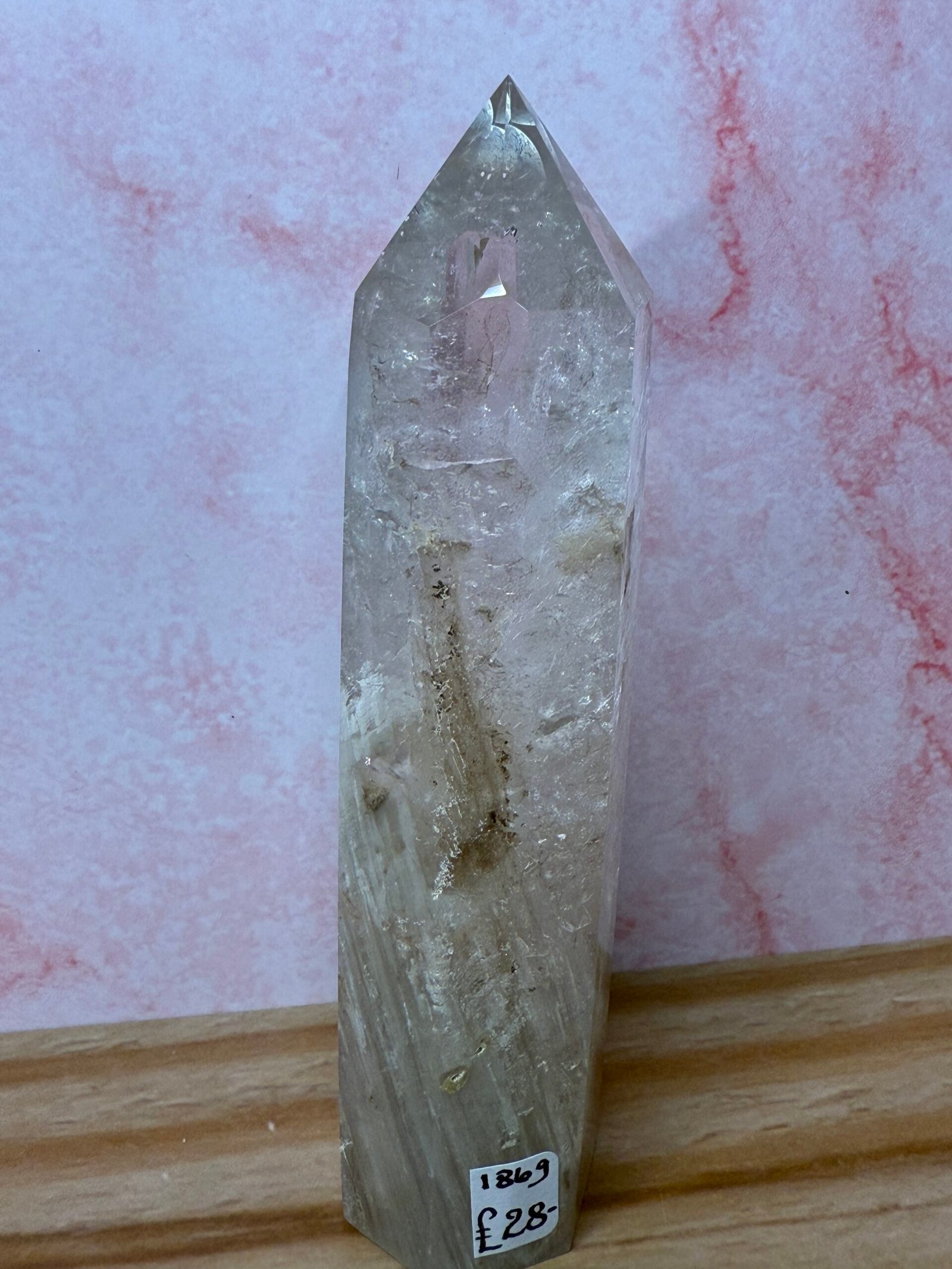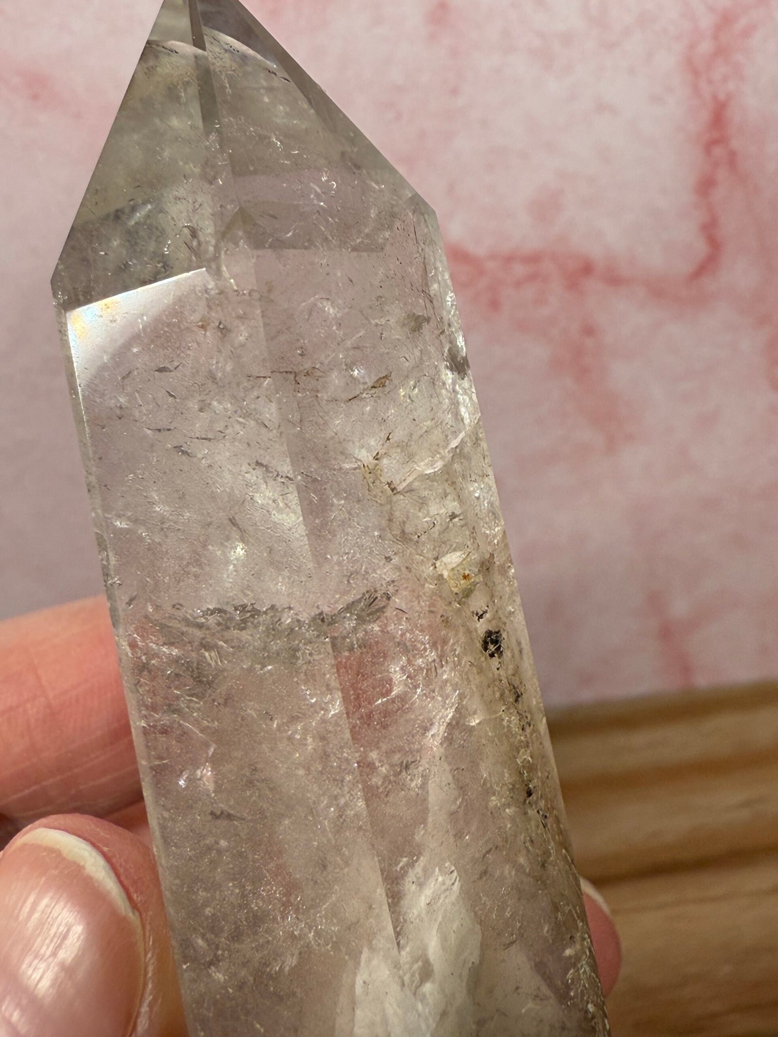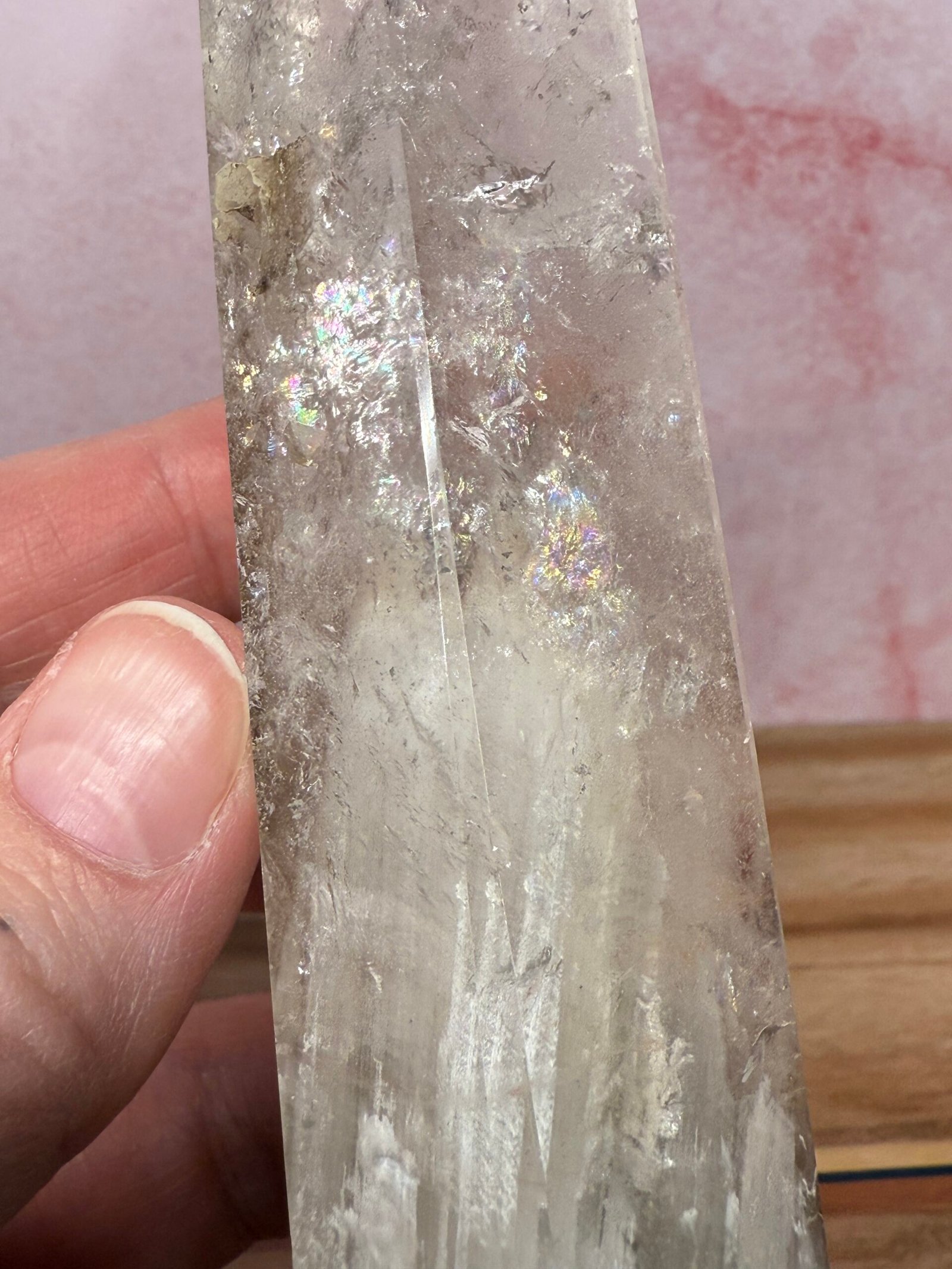 Frost white cliff reaching upwards, towards a clear point with rainbows. That’s how I’d describe this beautiful rare white garden Quartz tower. So much nicer in person, my photography skills do it no justice.