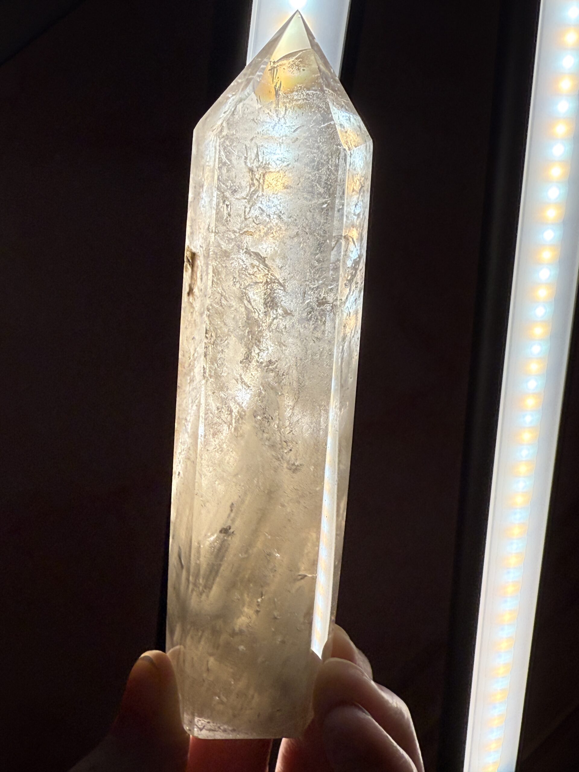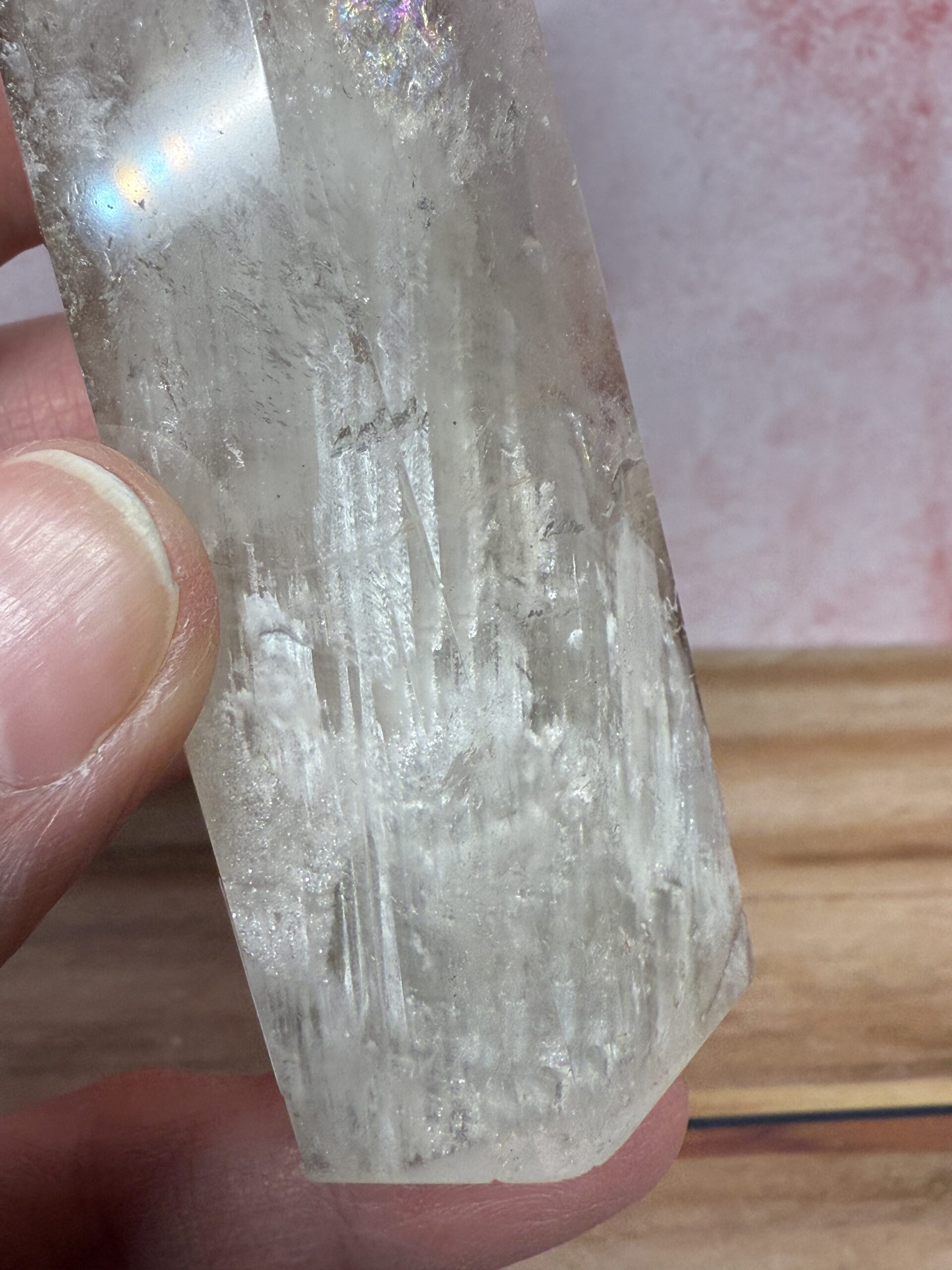 Frost white cliff reaching upwards, towards a clear point with rainbows. That’s how I’d describe this beautiful rare white garden Quartz tower. So much nicer in person, my photography skills do it no justice.